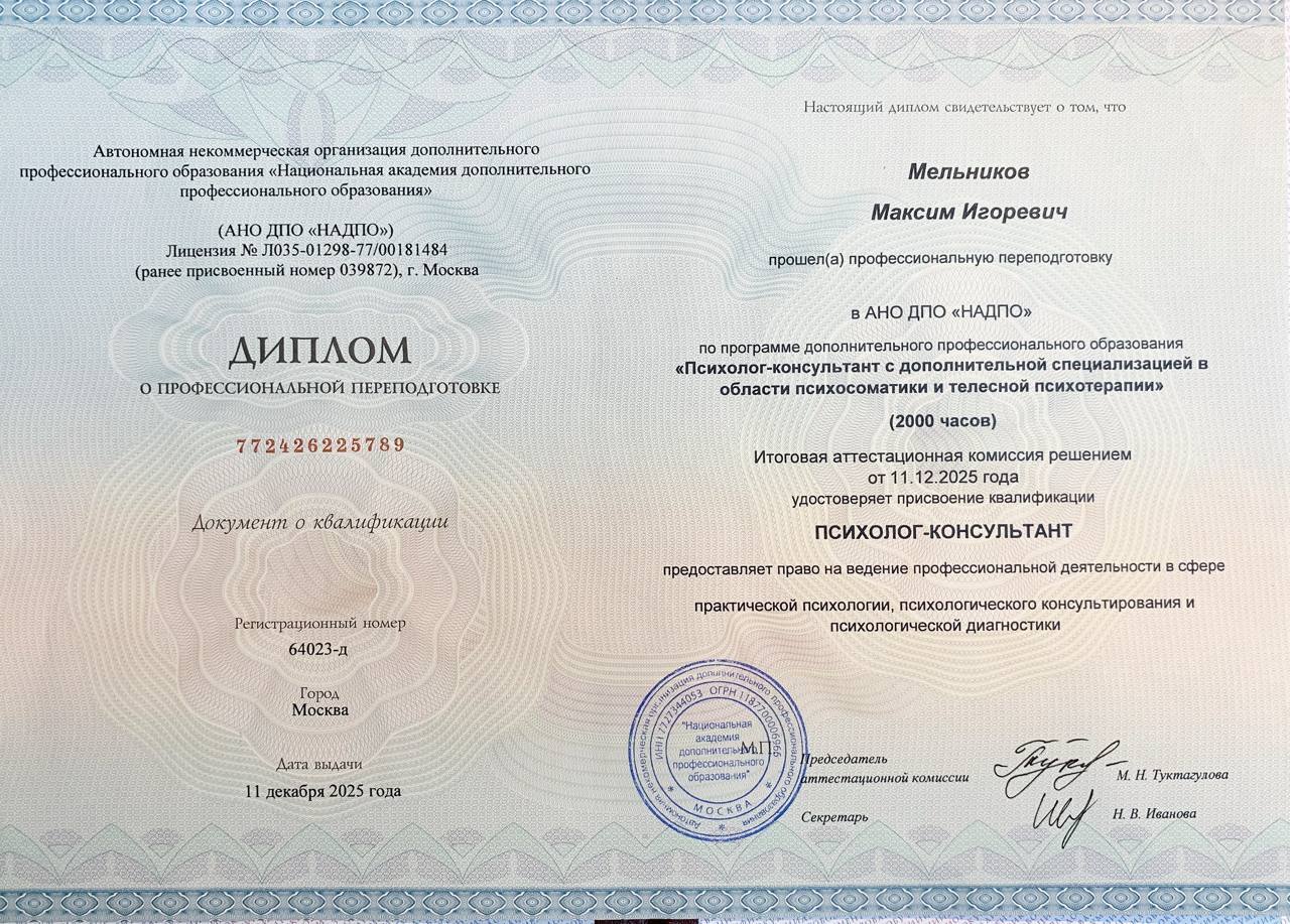 Психолог-консультант с дополнительной специализацией в области психосоматики и телесной психотерапии.